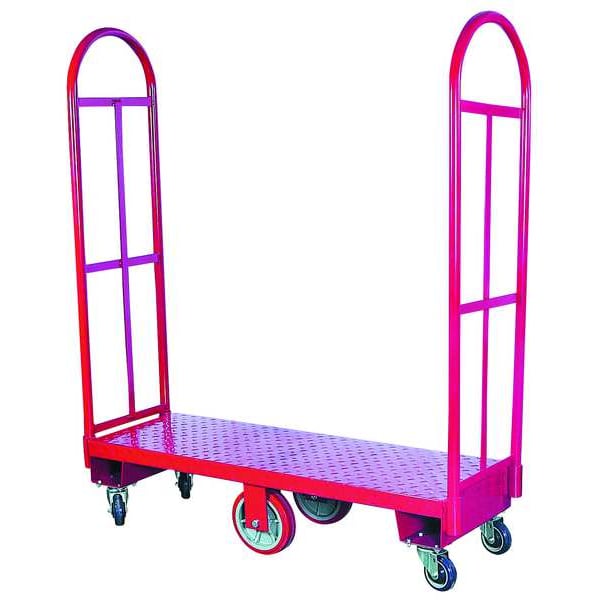 Narrow Steel-Deck Platform Truck, Load Capacity 2,000 lb, Overall Height 60 1/4 in, Overall Length 63 in, Overall Width 16 in, Deck Construction Solid, Deck Material Steel, Deck Gauge 18 ga, Deck Height 10 3/4 in, Deck Length 60 in, Deck Width 16 in, Deck Surface Ribbed, Frame Material Steel, Frame Finish/Coating Powder Coated, Handle Type (2) Tall, Side Panel Type No Side Panels, Number of Platforms 1, Color Red