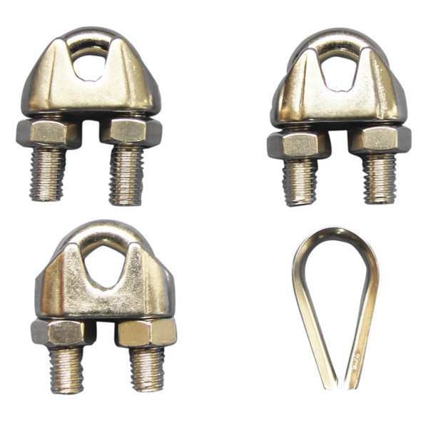 Wire Rope U-Bolt Clip and Thimble Kit, Compatible Rope Diameter 1/2 in, Rope Turnback Length 11 1/2 in, Number of Thimbles Included 1, Total Number of Fittings Included 3, Number of Clips Included 2, Number of Sleeves Included 0, Fitting Types Included U-Bolt Clip, Thimble, Clip Material 304 Stainless Steel, Sleeve Material Not Applicable, Thimble Material Stainless Steel, Thimble Loop Inside Length 2 3/4 in, Thimble Loop Inside Width 1 3/4 in, Compatible Rope Material Stainless Steel