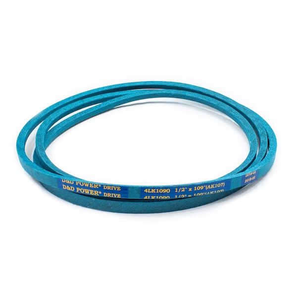 Belt, 4LK, 0.5 x 109in OC (AK107) D&D DURA-ULTIMATE-DW-BLADE belts meet or exceed USA RMA published ratings levels. They are manufactured to perform at higher levels than all major US Manufacturer’s belts of the same type. DURA-ULTIMATE-DW-BLADE belts are designed for lawn and garden equipment and any abusive drive application. They are manufactured with an outer dry fabric wrap for higher heat and oil resistance and also clutching applications. The tensile cords are manufactured with the highest quality Kevlar. These high quality cords are extremely resistant to severe repeated shock loads. D&D DURA-ULTIMATE DW-BLADE belts have been proven over and over again to exceed any OEM performance and quality.