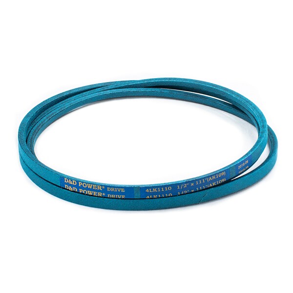 Belt, 4LK, 0.5 x 111in OC (AK109) D&D DURA-ULTIMATE-DW-BLADE belts meet or exceed USA RMA published ratings levels. They are manufactured to perform at higher levels than all major US Manufacturer’s belts of the same type. DURA-ULTIMATE-DW-BLADE belts are designed for lawn and garden equipment and any abusive drive application. They are manufactured with an outer dry fabric wrap for higher heat and oil resistance and also clutching applications. The tensile cords are manufactured with the highest quality Kevlar. These high quality cords are extremely resistant to severe repeated shock loads. D&D DURA-ULTIMATE DW-BLADE belts have been proven over and over again to exceed any OEM performance and quality.