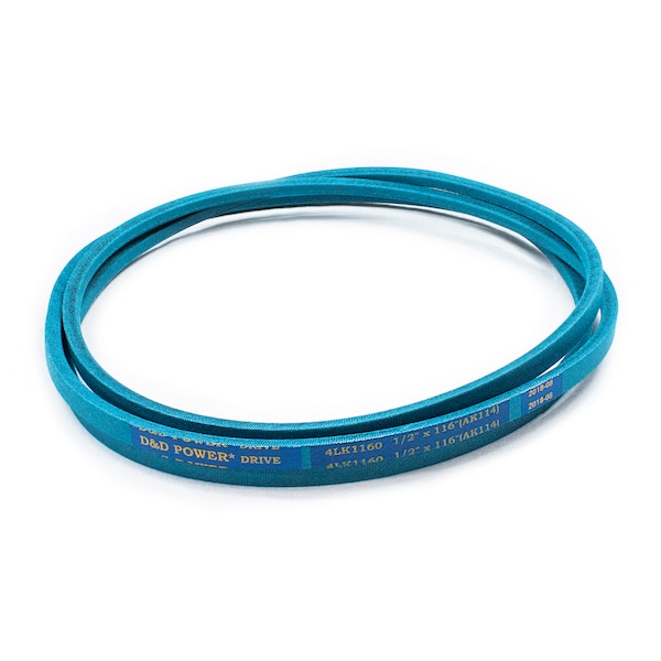 Belt, 4LK, 0.5 x 116in OC (AK114) D&D DURA-ULTIMATE-DW-BLADE belts meet or exceed USA RMA published ratings levels. They are manufactured to perform at higher levels than all major US Manufacturer’s belts of the same type. DURA-ULTIMATE-DW-BLADE belts are designed for lawn and garden equipment and any abusive drive application. They are manufactured with an outer dry fabric wrap for higher heat and oil resistance and also clutching applications. The tensile cords are manufactured with the highest quality Kevlar. These high quality cords are extremely resistant to severe repeated shock loads. D&D DURA-ULTIMATE DW-BLADE belts have been proven over and over again to exceed any OEM performance and quality.