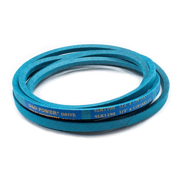 Belt, 4LK, 0.5 x 119in OC (AK117) D&D DURA-ULTIMATE-DW-BLADE belts meet or exceed USA RMA published ratings levels. They are manufactured to perform at higher levels than all major US Manufacturer’s belts of the same type. DURA-ULTIMATE-DW-BLADE belts are designed for lawn and garden equipment and any abusive drive application. They are manufactured with an outer dry fabric wrap for higher heat and oil resistance and also clutching applications. The tensile cords are manufactured with the highest quality Kevlar. These high quality cords are extremely resistant to severe repeated shock loads. D&D DURA-ULTIMATE DW-BLADE belts have been proven over and over again to exceed any OEM performance and quality.