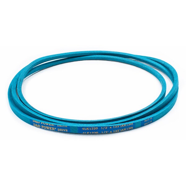 Belt, 4LK, 0.5 x 122in OC (AK120) D&D DURA-ULTIMATE-DW-BLADE belts meet or exceed USA RMA published ratings levels. They are manufactured to perform at higher levels than all major US Manufacturer’s belts of the same type. DURA-ULTIMATE-DW-BLADE belts are designed for lawn and garden equipment and any abusive drive application. They are manufactured with an outer dry fabric wrap for higher heat and oil resistance and also clutching applications. The tensile cords are manufactured with the highest quality Kevlar. These high quality cords are extremely resistant to severe repeated shock loads. D&D DURA-ULTIMATE DW-BLADE belts have been proven over and over again to exceed any OEM performance and quality.