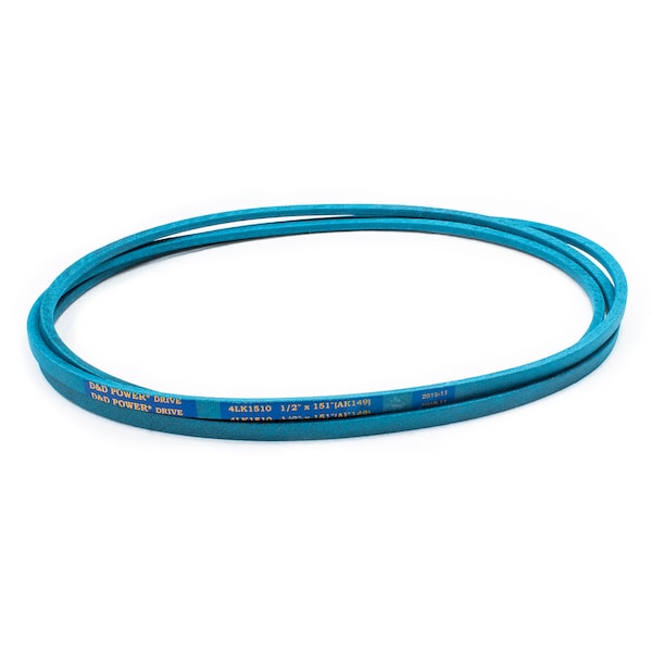 Belt, 4LK, 0.5 x 151in OC (AK149) D&D DURA-ULTIMATE-DW-BLADE belts meet or exceed USA RMA published ratings levels. They are manufactured to perform at higher levels than all major US Manufacturer’s belts of the same type. DURA-ULTIMATE-DW-BLADE belts are designed for lawn and garden equipment and any abusive drive application. They are manufactured with an outer dry fabric wrap for higher heat and oil resistance and also clutching applications. The tensile cords are manufactured with the highest quality Kevlar. These high quality cords are extremely resistant to severe repeated shock loads. D&D DURA-ULTIMATE DW-BLADE belts have been proven over and over again to exceed any OEM performance and quality.
