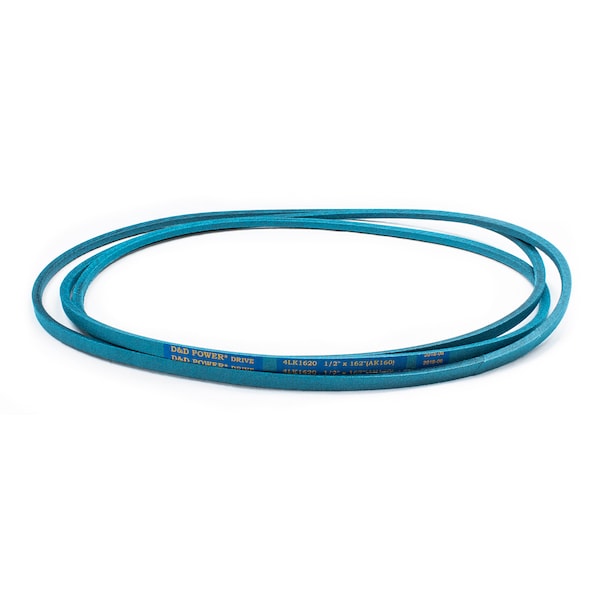 Belt, 4LK, 0.5 x 162in OC (AK160) D&D DURA-ULTIMATE-DW-BLADE belts meet or exceed USA RMA published ratings levels. They are manufactured to perform at higher levels than all major US Manufacturer’s belts of the same type. DURA-ULTIMATE-DW-BLADE belts are designed for lawn and garden equipment and any abusive drive application. They are manufactured with an outer dry fabric wrap for higher heat and oil resistance and also clutching applications. The tensile cords are manufactured with the highest quality Kevlar. These high quality cords are extremely resistant to severe repeated shock loads. D&D DURA-ULTIMATE DW-BLADE belts have been proven over and over again to exceed any OEM performance and quality.