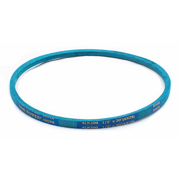 Belt, 4LK, 0.5 x 30in OC (AK28) D&D DURA-ULTIMATE-DW-BLADE belts meet or exceed USA RMA published ratings levels. They are manufactured to perform at higher levels than all major US Manufacturer’s belts of the same type. DURA-ULTIMATE-DW-BLADE belts are designed for lawn and garden equipment and any abusive drive application. They are manufactured with an outer dry fabric wrap for higher heat and oil resistance and also clutching applications. The tensile cords are manufactured with the highest quality Kevlar. These high quality cords are extremely resistant to severe repeated shock loads. D&D DURA-ULTIMATE DW-BLADE belts have been proven over and over again to exceed any OEM performance and quality.
