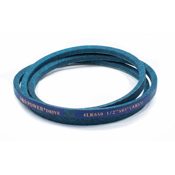 Belt, 4LK, 0.5 x 65in OC (AK63) D&D DURA-ULTIMATE-DW-BLADE belts meet or exceed USA RMA published ratings levels. They are manufactured to perform at higher levels than all major US Manufacturer’s belts of the same type. DURA-ULTIMATE-DW-BLADE belts are designed for lawn and garden equipment and any abusive drive application. They are manufactured with an outer dry fabric wrap for higher heat and oil resistance and also clutching applications. The tensile cords are manufactured with the highest quality Kevlar. These high quality cords are extremely resistant to severe repeated shock loads. D&D DURA-ULTIMATE DW-BLADE belts have been proven over and over again to exceed any OEM performance and quality.