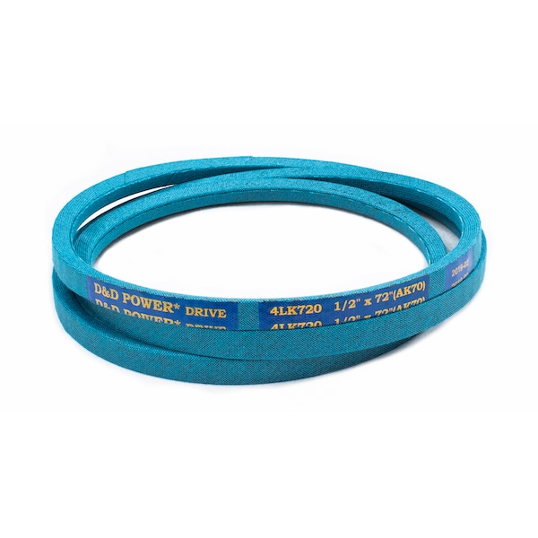 Belt, 4LK, 0.5 x 72in OC (AK70) D&D DURA-ULTIMATE-DW-BLADE belts meet or exceed USA RMA published ratings levels. They are manufactured to perform at higher levels than all major US Manufacturer’s belts of the same type. DURA-ULTIMATE-DW-BLADE belts are designed for lawn and garden equipment and any abusive drive application. They are manufactured with an outer dry fabric wrap for higher heat and oil resistance and also clutching applications. The tensile cords are manufactured with the highest quality Kevlar. These high quality cords are extremely resistant to severe repeated shock loads. D&D DURA-ULTIMATE DW-BLADE belts have been proven over and over again to exceed any OEM performance and quality.