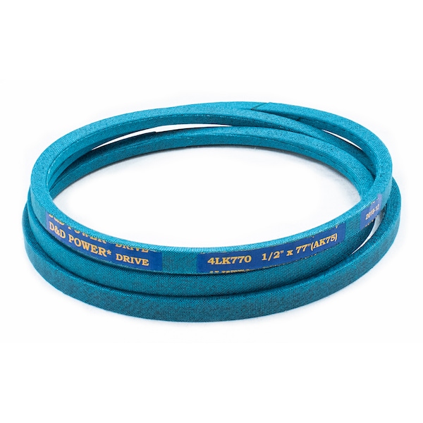 Belt, 4LK, 0.5 x 77in OC (AK75) D&D DURA-ULTIMATE-DW-BLADE belts meet or exceed USA RMA published ratings levels. They are manufactured to perform at higher levels than all major US Manufacturer’s belts of the same type. DURA-ULTIMATE-DW-BLADE belts are designed for lawn and garden equipment and any abusive drive application. They are manufactured with an outer dry fabric wrap for higher heat and oil resistance and also clutching applications. The tensile cords are manufactured with the highest quality Kevlar. These high quality cords are extremely resistant to severe repeated shock loads. D&D DURA-ULTIMATE DW-BLADE belts have been proven over and over again to exceed any OEM performance and quality.