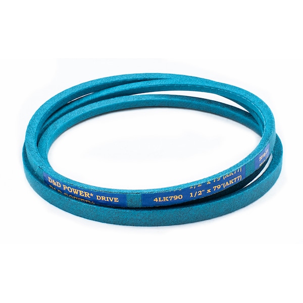 Belt, 4LK, 0.5 x 79in OC (AK77) D&D DURA-ULTIMATE-DW-BLADE belts meet or exceed USA RMA published ratings levels. They are manufactured to perform at higher levels than all major US Manufacturer’s belts of the same type. DURA-ULTIMATE-DW-BLADE belts are designed for lawn and garden equipment and any abusive drive application. They are manufactured with an outer dry fabric wrap for higher heat and oil resistance and also clutching applications. The tensile cords are manufactured with the highest quality Kevlar. These high quality cords are extremely resistant to severe repeated shock loads. D&D DURA-ULTIMATE DW-BLADE belts have been proven over and over again to exceed any OEM performance and quality.