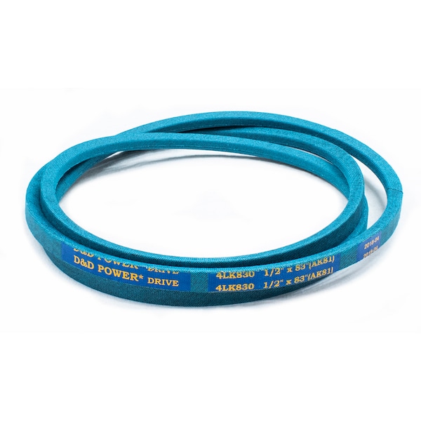 Belt, 4LK, 0.5 x 83in OC (AK81) D&D DURA-ULTIMATE-DW-BLADE belts meet or exceed USA RMA published ratings levels. They are manufactured to perform at higher levels than all major US Manufacturer’s belts of the same type. DURA-ULTIMATE-DW-BLADE belts are designed for lawn and garden equipment and any abusive drive application. They are manufactured with an outer dry fabric wrap for higher heat and oil resistance and also clutching applications. The tensile cords are manufactured with the highest quality Kevlar. These high quality cords are extremely resistant to severe repeated shock loads. D&D DURA-ULTIMATE DW-BLADE belts have been proven over and over again to exceed any OEM performance and quality.