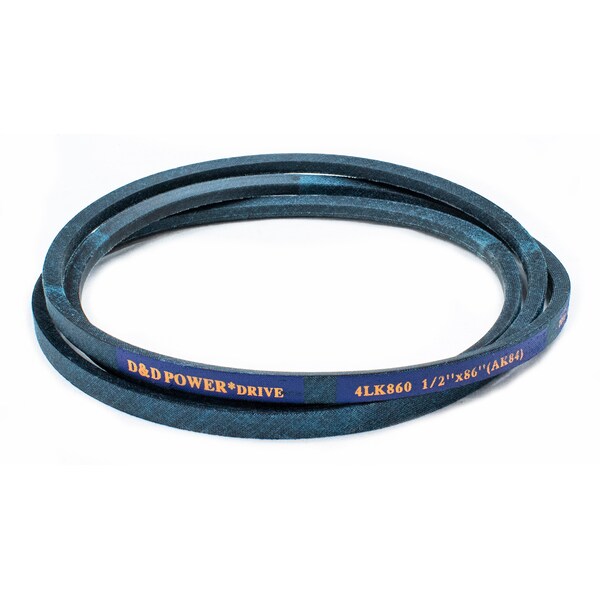 Belt, 4LK, 0.5 x 86in OC (AK84) D&D DURA-ULTIMATE-DW-BLADE belts meet or exceed USA RMA published ratings levels. They are manufactured to perform at higher levels than all major US Manufacturer’s belts of the same type. DURA-ULTIMATE-DW-BLADE belts are designed for lawn and garden equipment and any abusive drive application. They are manufactured with an outer dry fabric wrap for higher heat and oil resistance and also clutching applications. The tensile cords are manufactured with the highest quality Kevlar. These high quality cords are extremely resistant to severe repeated shock loads. D&D DURA-ULTIMATE DW-BLADE belts have been proven over and over again to exceed any OEM performance and quality.