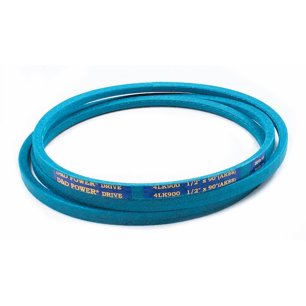 Belt, 4LK, 0.5 x 90in OC (AK88) D&D DURA-ULTIMATE-DW-BLADE belts meet or exceed USA RMA published ratings levels. They are manufactured to perform at higher levels than all major US Manufacturer’s belts of the same type. DURA-ULTIMATE-DW-BLADE belts are designed for lawn and garden equipment and any abusive drive application. They are manufactured with an outer dry fabric wrap for higher heat and oil resistance and also clutching applications. The tensile cords are manufactured with the highest quality Kevlar. These high quality cords are extremely resistant to severe repeated shock loads. D&D DURA-ULTIMATE DW-BLADE belts have been proven over and over again to exceed any OEM performance and quality.