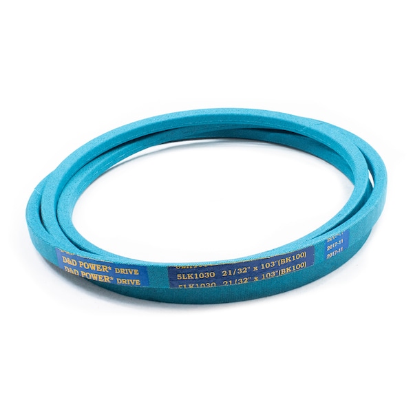 Belt, 5LK, 0.625 x 103in OC, (BK100) D&D DURA-ULTIMATE-DW-BLADE belts meet or exceed USA RMA published ratings levels. They are manufactured to perform at higher levels than all major US Manufacturer’s belts of the same type. DURA-ULTIMATE-DW-BLADE belts are designed for lawn and garden equipment and any abusive drive application. They are manufactured with an outer dry fabric wrap for higher heat and oil resistance and also clutching applications. The tensile cords are manufactured with the highest quality Kevlar. These high quality cords are extremely resistant to severe repeated shock loads. D&D DURA-ULTIMATE DW-BLADE belts have been proven over and over again to exceed any OEM performance and quality.
