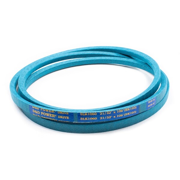Belt, 5LK, 0.625 x 106in OC, (BK103) D&D DURA-ULTIMATE-DW-BLADE belts meet or exceed USA RMA published ratings levels. They are manufactured to perform at higher levels than all major US Manufacturer’s belts of the same type. DURA-ULTIMATE-DW-BLADE belts are designed for lawn and garden equipment and any abusive drive application. They are manufactured with an outer dry fabric wrap for higher heat and oil resistance and also clutching applications. The tensile cords are manufactured with the highest quality Kevlar. These high quality cords are extremely resistant to severe repeated shock loads. D&D DURA-ULTIMATE DW-BLADE belts have been proven over and over again to exceed any OEM performance and quality.