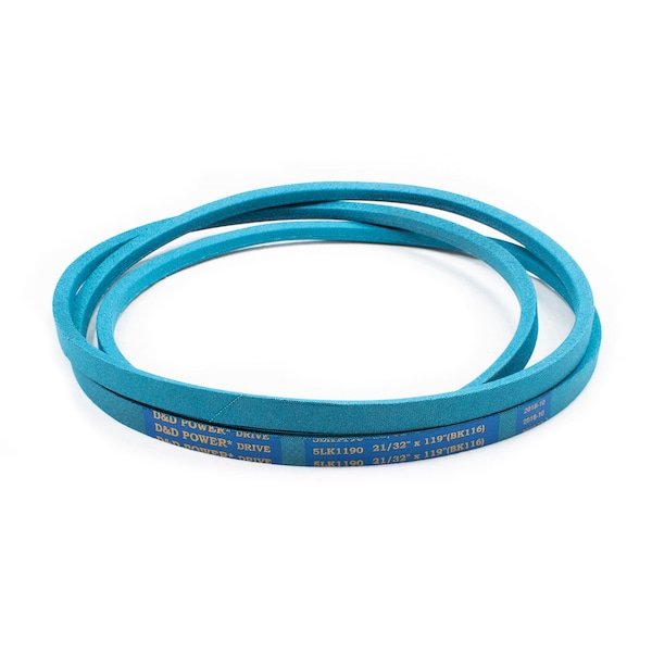 Belt, 5LK, 0.625 x 119in OC, (BK116) D&D DURA-ULTIMATE-DW-BLADE belts meet or exceed USA RMA published ratings levels. They are manufactured to perform at higher levels than all major US Manufacturer’s belts of the same type. DURA-ULTIMATE-DW-BLADE belts are designed for lawn and garden equipment and any abusive drive application. They are manufactured with an outer dry fabric wrap for higher heat and oil resistance and also clutching applications. The tensile cords are manufactured with the highest quality Kevlar. These high quality cords are extremely resistant to severe repeated shock loads. D&D DURA-ULTIMATE DW-BLADE belts have been proven over and over again to exceed any OEM performance and quality.