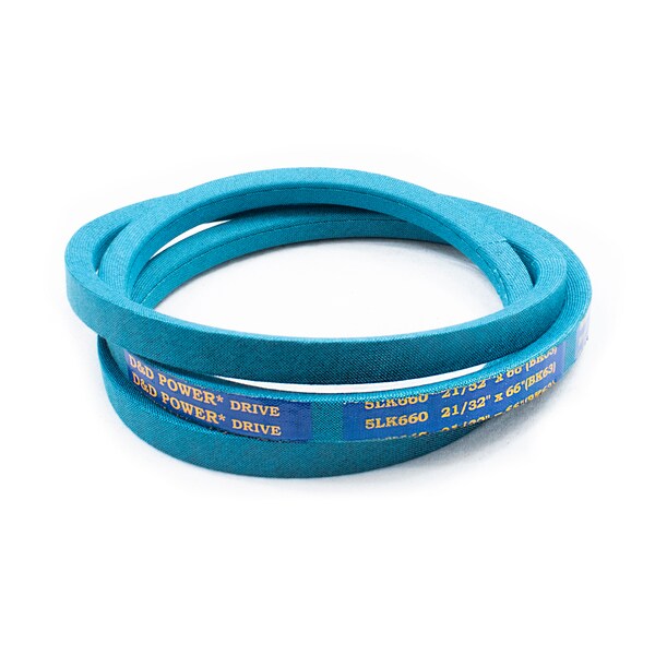 Belt, 5LK, 0.625 x 66in OC, (BK63) D&D DURA-ULTIMATE-DW-BLADE belts meet or exceed USA RMA published ratings levels. They are manufactured to perform at higher levels than all major US Manufacturer’s belts of the same type. DURA-ULTIMATE-DW-BLADE belts are designed for lawn and garden equipment and any abusive drive application. They are manufactured with an outer dry fabric wrap for higher heat and oil resistance and also clutching applications. The tensile cords are manufactured with the highest quality Kevlar. These high quality cords are extremely resistant to severe repeated shock loads. D&D DURA-ULTIMATE DW-BLADE belts have been proven over and over again to exceed any OEM performance and quality.