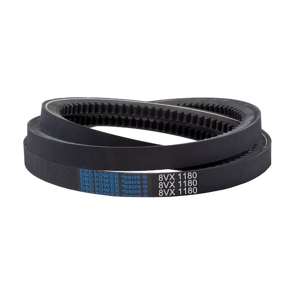 Belt, 8VX, 1 x 118in OC D&D DURA-EXTREME WEDGE belts meet or exceed USA RMA published ratings levels. They are manufactured to perform at dentical or higher levels than all major US Manufacturer’s belts of the same type. The outside fabric wrap is treated with highly oil and heat resistant, engineered synthetic rubber, specifically compounded for superior wear resistance, proven through thousands of hours of customer use to be durable and dependable. The helically wound tensile cords are specially manufactured with, twisted, heat and chemically set, polyester. The body rubber is a highly engineered synthetic rubber compound, specially compounded for cool running, crack resistance, and excellent bonding to the outside fabric and tensile cords. DURA-EXTREME WEDGE belts have a more narrow, deeper wedge shape V with higher power capability and more efficient load carrying characteristics. They allow for smaller and more compact drives. DURA-EXTREME WEDGE belts are cogged for superior flexibility. They are belts recommended for any application with smaller diameter pulleys. All DURA-EXTREME WEDGE belts are manufactured using the latest in belt technology.