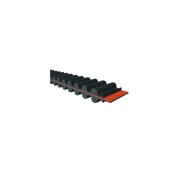 DUAL DURA-SYNC TORQUE synchronous belts feature a dual sided HTD tooth profile. Double sided timing belts offer power transmission from both sides, and are often used in reversing and serpentine applications. They are manufactured with a heavy duty, woven, nylon based fabric tooth covering. The backing is precisely ground for smooth uniform running. The helically wound tensile cords are engineered, twisted and chemically set stranded fiberglass material. They are made with a high temperature chloroprene polymer throughout the belt, and are proven through thousands of hours of customer use to be durable and dependable. All DUAL DURA-SYNC TORQUE timing belts are manufactured using the latest in synchronous belt technology.