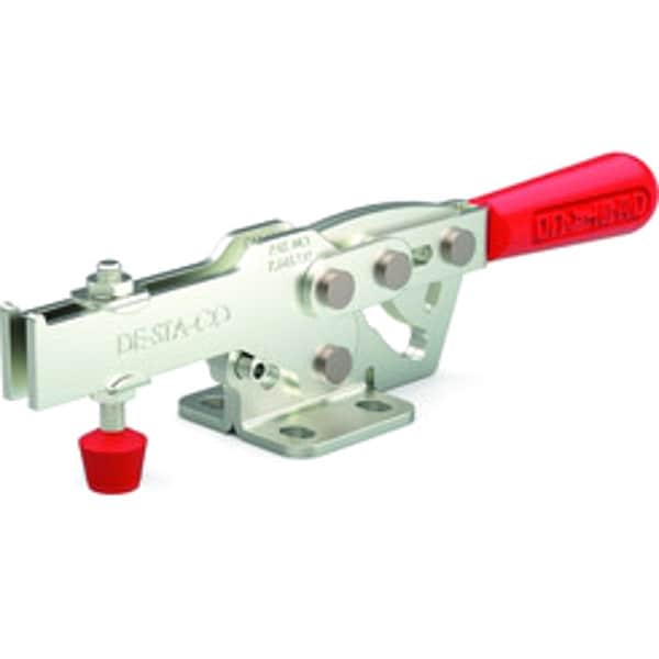 Toggle Clamp, Base Mounting Style Flange, Handle Orientation Horizontal, Holding Capacity - Maximum 560 lbf, Arm Style U-Bar, Tip Material Neoprene, Clamp Arm Opening Angle 73 Degrees , Arm Length 2.53 in, Height Under Arm 0.98 in, Includes Locking Handle No, Accommodates Workpiece Variation No, Application Assembly, Checking Fixtures, Clamping, Closures, Welding, Woodworking, Body Material Steel, Handle Color Red, Includes Flanged Washer (215105), Spindle (215208-M)