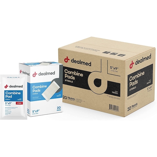 Dealmed Sterile Abdominal (ABD) Combine Pads, 5" x 9", 20 Count - Dealmed Sterile ABD Combine Pads are designed to be used when high absorbency is needed for heavy draining wounds. The outer cover is made of soft, non-woven material and the fluffy inner fill is effective in absorbing and dispersing fluids. The sealed edges prevent leakages. Dealmed Sterile ABD Pads come packed in peel down pouches for added convenience in aseptic handling.