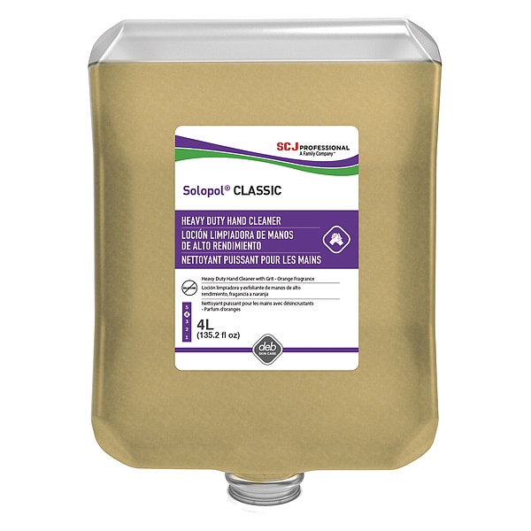 Hand Cleaner, Color Beige, Form Paste, Product Type Hand Cleaner, Series Solopol, Container Size 4 L, Container Type Cartridge, Fragrance Orange, Hygiene Properties Silicone Free, Formula Aloe Barbadensis Leaf Extract, Aqua, Castor Oil, Cellulose Gum, Citric Acid, Glyceryl Oleate Citrate, Juglans Regia (Walnut) Shell Powder, Laureth-5, Oleic Acid, Sodium Benzoate, Sodium Chloride, Sodium Laureth Sulfate, Sulfated, Titanium Dioxide, Xanthum Gum, Includes Grit Yes