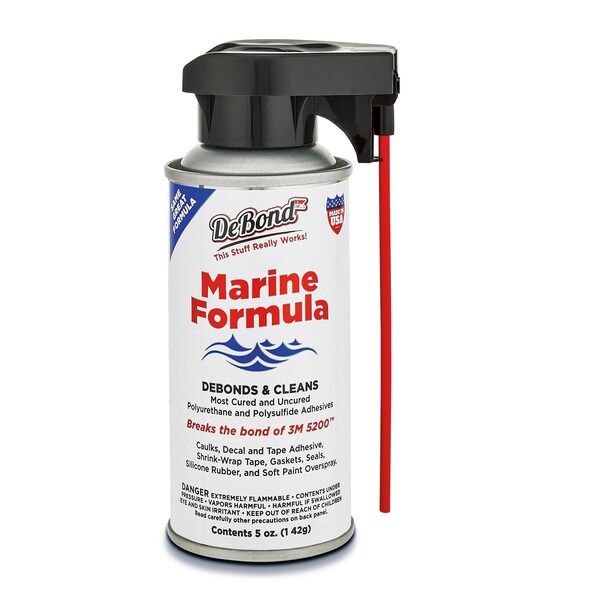 Marine Formula is a specially formulated patented mixture that cleans and removes adhesives and sealants used on and inside the boat. Use Marine Formula to clean up and remove these common marine adhesives and sealants. Cured 3M 5200, polysulfide sealants and other polyurethane adhesives. Removes caulks, sealants, black rub marks, adhesive residue, liquid nails, graffiti and overspray. Cleans adhesive film from duct and masking tape. Will not harm: Gelcoat, Clear Coat, Plexiglass, AwlGrip or Imron. 5 oz. aerosol can.