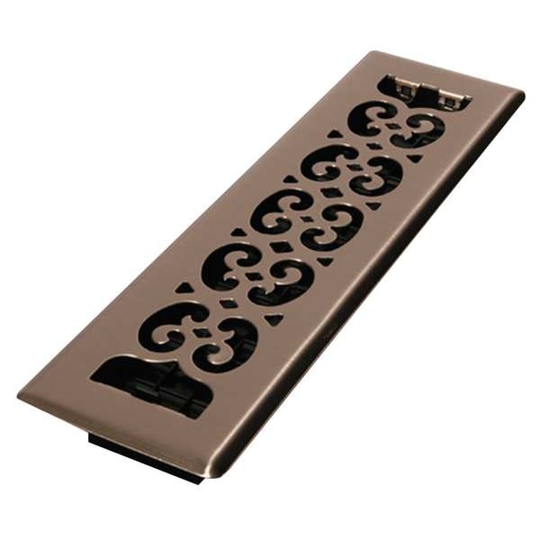 Floor Register, Overall Depth 1 3/8 in, Overall Height 15 1/2 in, Overall Width 3 3/4 in, Maximum Opening Height 13 7/8 in, Maximum Opening Width 2 3/8 in, Filter Depth 15 1/2 in, Filter Height 1 3/8 in, Filter Width 3 3/4 in, Grille Color Nickel, Grille Material Steel, Material Steel, Damper Material Plastic, Bar Spacing Not Applicable, Face Design Decorative, Airflow Directions One-Way, Adjustable Blades No, Mounting Location Floor, Mounting Style Lay-In, Blade Angle 180 Degrees