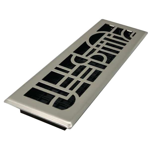 Floor Register, Overall Depth 1 3/8 in, Overall Height 13 1/2 in, Overall Width 5 1/2 in, Maximum Opening Height 11 7/8 in, Maximum Opening Width 4 in, Filter Depth 1 3/8 in, Filter Height 13 1/2 in, Filter Width 5 1/2 in, Grille Color Nickel, Grille Material Steel, Material Plated Steel, Damper Material Plastic, Bar Spacing Not Applicable, Face Design Decorative, Airflow Directions One-Way, Adjustable Blades No, Mounting Location Floor, Mounting Style Lay-In, Blade Angle 180 Degrees