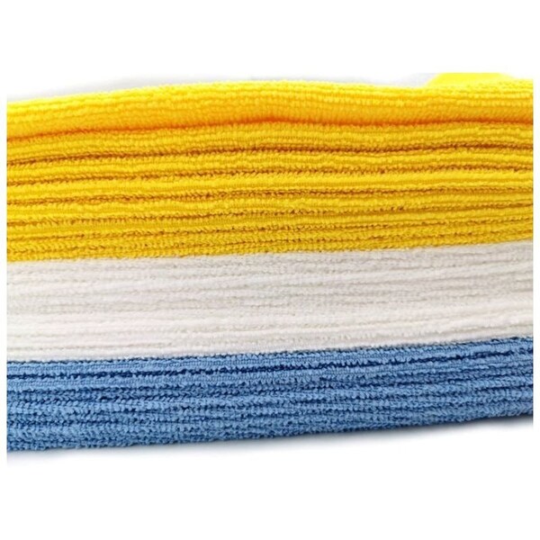 25 Piece Multicolor Microfiber Towel AssortmentMaterial: 80% Polyester, 20% PolyamideSize: 30 30cmWeight: 225 gramsPackaging: 25 pieces per polybag with cartonSuper Absorbent Works Great AnywhereThese microfiber cleaning cloths are an effective and reusable tool for cleaning your car, truck, boat, or household surfaces. Its small and convenient, can be used for a variety of cleaning jobs. Perfect in the garage for cleaning cars, trucks, boats, as well as in your home, kitchen, bathroom and more.Super AbsorbentThe soft microfiber used in these cloths is super absorbent and made to trap dirt, grime, and other particles without leaving any lint or streak residue behind or scratching paints, coats, or other surfaces. The soft, non-abrasive microfiber material can absorb eight times its own weight and doesn't require any chemicals to clean.No Need to Throw Out.Unlike paper towels or other disposable cleaning cloths, This microfiber cleaning cloths are machine washable and can be reused hundreds of times without losing absorbency. For best washing results, wash cleaning cloths with like colors in cold water.Ultra soft, non-abrasive microfiber cloths will not scratch paints, coats or other surfacesCleans with or without chemical cleaners, leaves lint and streak free resultsAbsorbs eight times its own weightPack comes with three different towel colors blue, yellow, and whiteRinse and reuse 100's of times