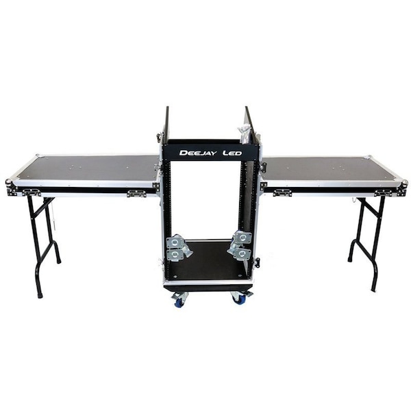 Engineered to Hold 11u Slant Mixer Rack on top & 16u Universal Vertical DJ Rack System. Complete with removable top cover while the front and rear covers double as detachable table tops for use in the left and right side. Heavy Duty Pre-Tapped Rack Rails Including Mounting Hardware3.5-Inch Diameter Durable And Noiseless Casters For Ease of Transportation Three Removable Covers Allows For Easy Use Two Side Tables For The Convenience of Mounting Additional Equipment Industrial Grade Recessed Spring Loaded Split Dish Butterfly Closure Latches with Padlock Tab with a Shackle Opening of about 7mm.Heavy Duty Ball Corners w/ Stacking Dimple On Bottom Side Allows for Centering and Stability when Stacking Multiple Units.ATA-300 Style Durable Transport Case is a Heavy Duty Professional Style With Industry Recognized Impact Standards Ideal for Safe Travel. Well Riveted Heavy Duty Double Edge Tongue and Groove Impact Resistant Aluminum FrameElectronics Equipment Shown, Described or Referenced is not Included with the Case, the Item is a Case Which Allows you to Use, Mount or Transport your Own Equipment.Table Dimensions: 32.5-in Width x 20.75-in Depth x 30-in HeightOpen dimensions with tables attached: 85-3/4-in Width x 26-in Center Depth x 38.25-in Center Height Min x 43-1/8-in Center Height Max.Center Rack Holes To Center Width: 18.25-inClosed Dimensions: 29.75-in x 21-3/8-in x 40.25-in Height add about 5-in for castorsWidth inside case is about 19-in in lower portion and 18-1/8-in upper portionPackaged dimensions is about 30.25-in x 22-3/8-in x 40.75-in