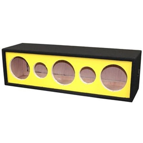 This is actually a box that accompanies a 10-in box. not included or used separately. It is designed to hold three standard size horns. Although it can hold alternatively three 6.5 inch speakers with an approximate 5.7 inch mounting hole. It is ideally suited also to hold sealed back midrange speakers of the same dimension.Or maybe a combo of any mix of the above.15mm plywood contruction with carpeted exterior with Yellow Vinyl cloth colored frontRear side comes unattached for rear side optionsEmpty speaker housing for three horns and two tweetersCan also be used for three mid woofers and two tweetersHeavy duty carpet with quality embroidered stitched logo95-mm 3.74-inches round openings for two tweeters14.5 cm 5.7-inches round openings for three hornsIncludes the DEEJAY LED model 8 conductor quick release plug socket requires model TBH8PINMALE not included to use installed plug, or speakon 8 pin f plugsDimensions: 31.1-in x 9.05-in x 9.05-in high