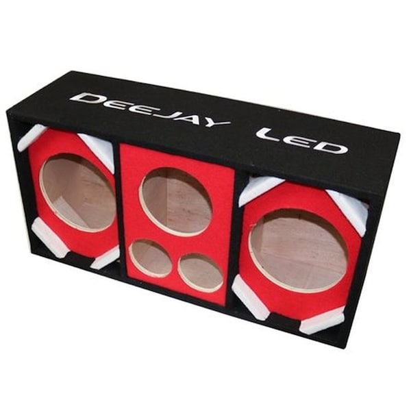 Empty speaker housing for two 8-in woofers and two tweeters and one horn Three sealed chambers with two quad ports one for each woofer Heavy duty carpet with quality embroidered stitched logo 12mm plywood heavy duty construction 7-in available speaker depth 183mm round openings for two 8-in woofers Two tweeter holes: 95mm diameter One 145mm opening for horn Includes the DEEJAY LED model 8 conductor quick release plug socket requires model TBH8PINMALE not included to use installed plug, or speakon 8 pin f plugs Dimensions: 27.63-in x 9.18-in x 13.63-in high