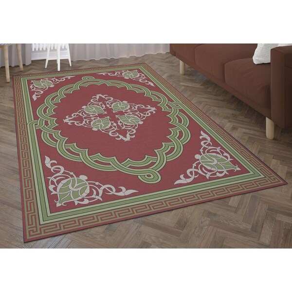 Art does not have to be displayed exclusively on walls. Let your floors show off some flair too! A modern twist on traditional style, the rug design blends a clean aesthetic with the classic intricate medallion featured in the center. Featuring a bold scheme of green hues against a deep red background, it will stand out in any space. Machine tufted with durable synthetic fibers, it has a soft and comfortable texture, does not shed, and is easy to clean. Its low .25” pile makes it ideal for high traffic areas of your home and will not obstruct doorways. A slip resistant latex backing keeps the area rug safely in place. Whether you display it in your living room, bedroom, home office, dining room, foyer, or nursery, it’ll bring your home décor to the next level.