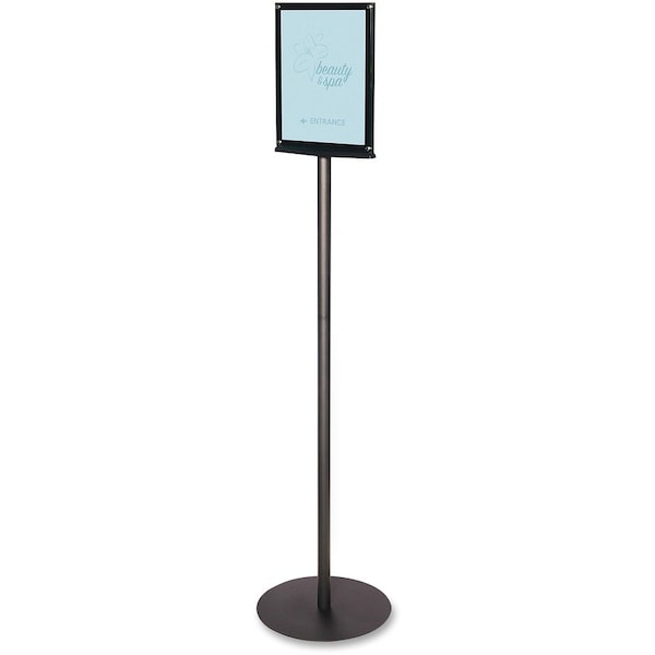 Double-sided sign stand offers front and back display of letter-size inserts. Ideal for reception areas, trade shows and waiting rooms. Clear magnetic panels with green-tinted edges allow quick, easy sign changes. Permanent, black back panel frames your messages. Weighted base stabilizes the sign. Sign stand holds up two letter-size inserts and features a metal post and a plastic sign.