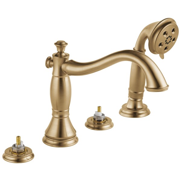 Complete your bath with a beautifully designed Delta roman tub faucet, meticulously crafted to turn heads and enhance your experience. The included hand shower makes this a versatile addition to your bath, perfect for rinsing off, washing loved ones and pets or keeping your tub clean. Delta® H2Okinetic® Hand Showers look different because they are different. Using advanced technology, H2Okinetic Hand Showers sculpt water into a unique wave pattern, giving you 3X the coverage of a standard shower head.* The end result is a hand shower that provides more coverage, more warmth and more intensity for a truly drenching experience. Designed to look like new for life, Brilliance® finishes are developed using a proprietary process that creates a durable, long-lasting finish that is will not corrode, tarnish or discolor. Take the chill out of contemporary with the eloquent warmth of Champagne Bronze in your bath. This vibrant, gold finish provides a vivid splash of contrast to your space for a look that's simultaneously modern and nimble, able to pair elegantly with traditional, transitional and contemporary décor. Brilliance finishes are durable, long-lasting and will not corrode, tarnish or discolor, so you can enjoy a coordinated bath you'll love to look at for life. *Coverage measured in accordance with EPA WaterSense® Specification for shower heads, March 4, 2010.