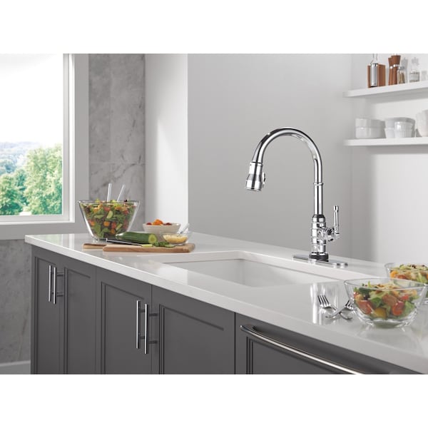 The powerful features of the Broderick Collection take center stage in the kitchen, with an industrial style that alludes to a rich heritage. Delta Touch2O faucets with Touchless Technology help keep germs and mess off your kitchen faucet and provides easy water control 3 ways: simply place your hand near the faucet, tap the faucet surface, or use standard handle activation. ShieldSpray Technology cleans with laser-like precision while containing mess and splatter. A concentrated jet powers away stubborn messes while an innovative shield of water contains splatter and clears off the mess, so you can spend less time soaking, scrubbing and shirt swapping. The TempSense LED light changes color to alert you to the waters temperature and eliminate any possible surprises or discomfort. MagnaTite Docking uses a powerful integrated magnet to pull your faucet spray wand precisely into place and hold it there so it stays docked when not in use. Delta faucets with Diamond Seal Technology perform like new for life with a patented design which reduces leak points, is less hassle to install and lasts twice as long as the industry standard.
