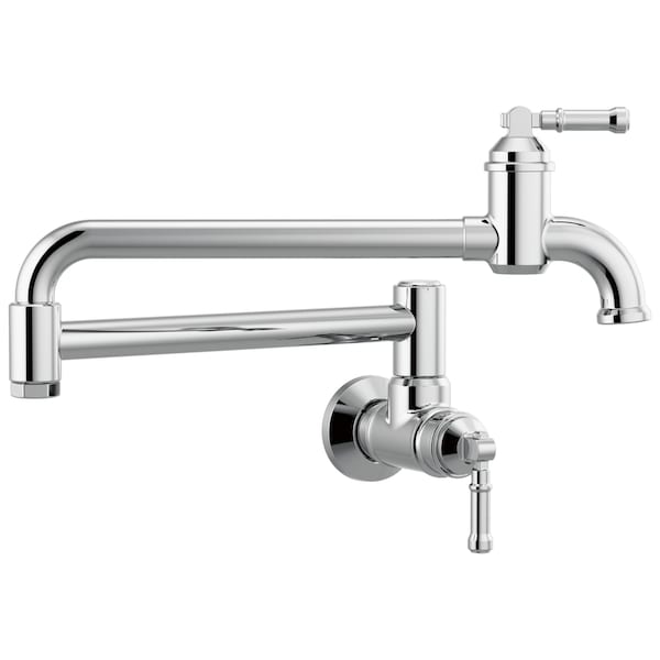 The powerful features of the Broderick Collection take center stage in the kitchen, with an industrial style that alludes to a rich heritage. The collection includes distinctive bridge faucet and pull-down spring spout faucet options that add a unique element to any kitchen. Styled after the rugged nuts and bolts of machinery, it serves as a true centerpiece in the kitchen. Filling pots on the stove has never been easier or more affordable, thanks to the new Delta Pot Filler faucet. A pot filler makes it easy to fill large cooking vessels quickly and without the walk from sink to stove.