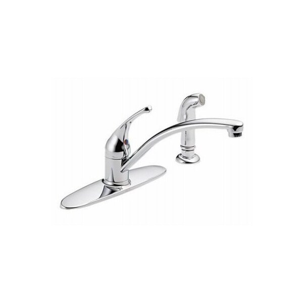 Delta Foundations, Chrome Finish, Single Handle Kitchen Faucet, With Side Spray, 4 Hole, 8 Installation, Standard Spout Swivels 360 Degree, 180 GPM 60 PSI, ADA Compliant