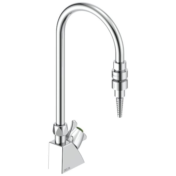 This deck-mount single faucet with rigid/swivel gooseneck comes complete with vandal resistant locking pin, 1/4 in. I.D. 10 serration nozzle, shank, locknut, lockwasher, 2 arm lab handle, TECK Lab structure, C.P. renewable brass seat, 1/4 in. NPT tailpiece, and coupling nut. It also includes an in-line dual check vacuum breaker and nozzle. The heavy-duty gooseneck spout is made from seamless brass pipe. Its unique design permits field installation as a rigid or swivel spout. The Delta Commercial offering goes beyond providing exceptional Commercial-grade performance with products that reflect the personality of the individual institution.