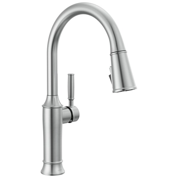 Command your kitchen with the symmetrical, statuesque design of the Renaldi Collection. The Delta ProClean Kitchen Spray provides a powerful, wide fan spray for quick and complete cleaning. Easily clean hard-to-reach places, help remove baked on messes and spray down your sink faster as the wide stream covers more surface area. Lumicoat Finishes easily wipe clean without the need for cleaners or chemicals and are guaranteed to resist mineral buildup and hard water stains. The ultra-sleek surface repels liquids, resisting water spots and staying cleaner longer, so your faucet stays beautiful. MagnaTite Docking uses a powerful integrated magnet to set your pull down sprayer precisely into place and hold it there so it stays docked when not in use. You can install with confidence, knowing that Delta kitchen faucets are backed by our Lifetime Limited Warranty.