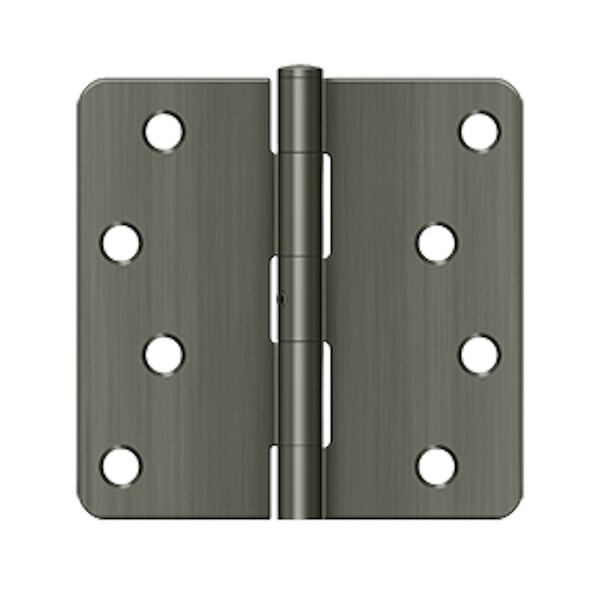 Deltana is the architectural hardware manufacturer with a proven record for exceptional service and quality. Deltana inventories the largest selection of architectural and door hardware in over nine fine finishes made from solid brass, zinc, aluminum, steel and stainless steel.. 4 x 4 x 1/4 Radius Hinge; Heavy Duty; Antique Nickel Finish