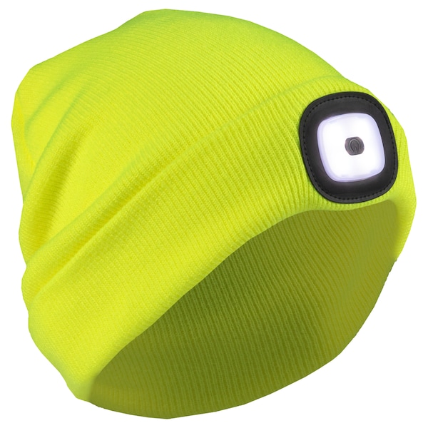 Hi Viz Lime 100% acrylic knit cap with USB rechargeable LED light. You can select three LED light brightness levels. Battery charge lasts approximately two to eight hours dependent upon brightness level used. One size fits most.