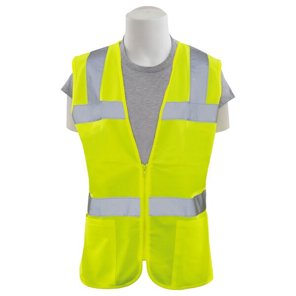 ANSI Type R, Class 2 women's fitted safety vest. 100% polyester tricot material. Vest features include zipper front closure, side slits for ease of movement, repositioned horizontal tape, and contoured waist. Two exterior waist pockets. Meets ANSI/ISEA 107-2015 requirements.