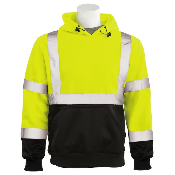 ANSI Type R, Class 3 Pullover Hoodie Sweatshirt, Hi-Viz Lime with Black Bottom, is 100% soft polyester fleece. Hoodie has cinch cord and cord lock to adjust fit. Sweatshirt has one large front pass-through hand warmer pocket that will fit a 5.5" cell phone in sturdy case. Ribbed knit cuffs and waistband aid to keep wearer warm. Meets ANSI/ISEA 107-2015.