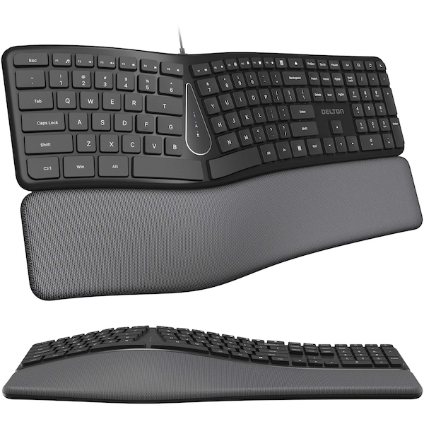 Ergonomic Design Recommended by RheumatologistsTransform your workspace with Delton wired keyboard with wrist rest, featuring an ergonomic design that reduces strain on your wrists and hands during extended use. Endorsed by rheumatologists, this desktop wired keyboard ensures a healthy typing posture, enabling you to work comfortably for extended periods without experiencing discomfort. It is equipped with contoured keys that enhance input accuracy and reduce the risk of errors.Effortless Typing Precision with Versatile CompatibilityExperience precise and efficient typing with our usb wired keyboard, designed for smooth and effortless key movement for a seamless typing experience. The soft, silent keys ensure accuracy without distracting noise, helping you maintain focus and productivity.This ergonomic wired keyboard is designed with USB functionality, ensuring easy setup and immediate use without the need for software installation. Our laptop keyboard is compatible with Windows, Mac, PCs, and laptops, ensuring versatility across different devices and operating systems. Streamlined Setup and Comfortable DesignOur wired computer keyboard comes equipped with dedicated multimedia shortcuts, enabling effortless control over volume, playback, and other functions. Carefully designed with a focus on productivity, this split computer keyboard optimizes efficiency and supports smooth workflow execution. It has a 4.9 ft. long, durable cable with usb-a connectivity that gives you the freedom to move around your workspace.Our quiet ergonomic keyboard includes a WristPad for added comfort during extended use, offering extra support. With a full-sized layout, it provides easy access to all the keys necessary for efficient typing and navigation, enhancing both user experience and productivity.