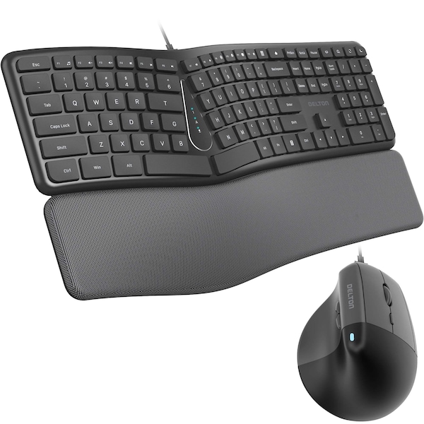 Ergonomic Comfort for Enhanced ProductivitySay goodbye to wrist strain with Deltons wired keyboard mouse combo, designed to promote comfort and reduce strain. Our vertical ergonomic mouse naturally aligns with your hand. ergonomic mouse wired providing a strain-reducing experience for extended use. The quiet wired keyboard features a plush, pillowed wristrest that supports long typing sessions. Recommended by Rheumatologists, this USB wired keyboard and mouse duo helps protect your wrists while ensuring you stay focused and productive throughout the day.Precision Control for Optimal EfficiencyUnlock your potential with our high-performance wired keyboard and mouse set! The Wired Mouse boasts 6 high-quality buttons, including left/right click, forward/backward, DPI switch, and a 3D scroll wheel for seamless control. With three adjustable DPI levels 800/1200/1600, you can customize your cursors sensitivity for precision. The full-sized wired computer keyboard features quiet ergonomic keys for a smooth and noise-free typing experience, ensuring you can work with complete focus.Quiet and Durable DesignWith our ergonomic set, you can experience a quieter, more peaceful workspace. The wired ergonomic mouse has noiseless buttons, eliminating the distracting clicking sounds typically found in standard devices. Similarly, the keyboard wired has quiet keys to ensure an undisturbed typing experience. Crafted for durability, both devices offer long-lasting performance while maintaining comfort, making them ideal for a variety of tasks such as working, gaming, or studying.Universal Compatibility for Seamless ConnectivityOur quiet ergonomic keyboard and mouse are designed to be compatible with various devices. This set ensures smooth operation across all platforms, whether using a PC, laptop, tablet, or even macOS and iOS. The vertical mouses optical sensor provides precise tracking, while the keyboard connects easily via USB-A with a 4.9-ft cable. Stay connected and productive across devices, making it an excellent choice for any setup at home or in the office.