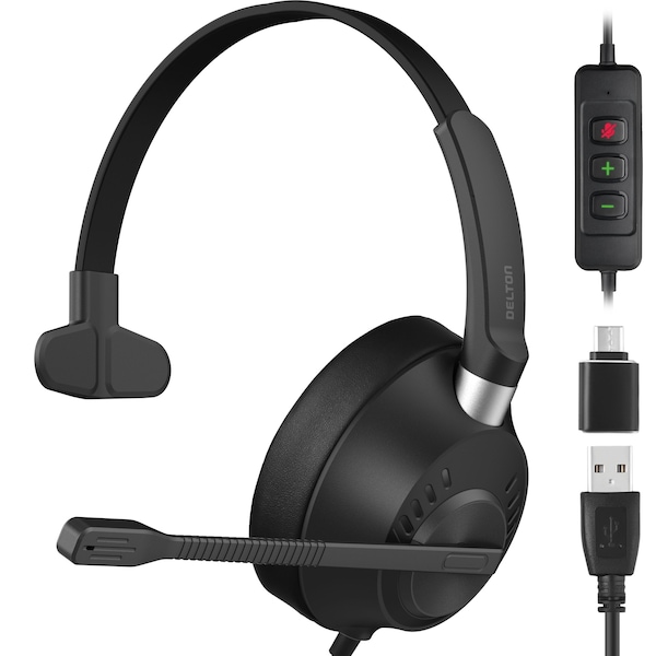 Experience unparalleled clarity in communication with the Delton 40Y meeting headset For PC call center headset with microphone, equipped with advanced ENC Environmental Noise Cancellation technology. This innovative feature efficiently reduces background noise, ensuring uninterrupted conversations for professional calls and virtual meetings. Whether you're amidst the hustle of a busy office or the chaos of a bustling household, this usb single ear headset has ENC capability to deliver your voice with pristine clarity, free from any unwanted disturbances. Dynamic Communication Control with Seamless ConnectivityFeaturing a flexible and adjustable microphone, our mono headset usb captures sound from all angles, ensuring clear voice pickup adaptable to diverse environments. It comes equipped with intuitive in-line controls for mic mute, meeting headset with mic, volume adjustment, and call handling, ensuring effortless audio management and enhancing your overall communication experience. The single ear headset with mic features a USB-A to USB-C adapter, providing seamless connectivity to mobile devices and tablets. Crafted for longevity, the 7.2 ft cable offers enduring durability, providing reliable connectivity and flexibility for prolonged usage. Ultimate Comfort and CompatibilityDelight in unparalleled clarity and immersive sound quality with our work headset with mic, designed for noise canceling headset for work from home. This headset offers compatibility with a wide range of devices, such as computers, laptops, iMacs, tablets, and smartphones, seamlessly integrating with multiple operating systems like Windows, MacOS, Android, and iOS.Meticulously designed for prolonged comfort, this single ear headset with mic features plush, soft ear cushions ensuring unparalleled comfort. Its adjustable headband ensures a snug fit for various head sizes, eliminating discomfort even during prolonged use