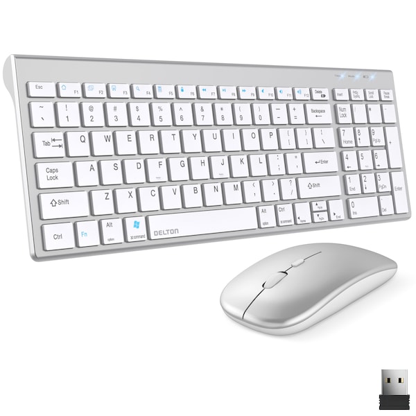 Transform your workspace with the Delton exclusive bundle, featuring a silent keyboard and mouse to enhance efficiency and functionality. Our bluetooth keyboard and mouse are easily connected to multiple devices via Bluetooth or the 2.4 GHz USB dongle, effortlessly switching between them for maximum productivity. Enjoy the freedom to move around with a reliable 30 ft connectivity range, ensuring a stable connection without interruptions.Precision, Comfort, and Efficient Power ManagementThe bluetooth keyboard and mouse combo ensures a smooth typing and navigation experience with its responsive keystrokes and 12 function keys for quick control. The cordless mouse features adjustable DPI settings of 800, 1200, and 1600, allowing you to customize the cursor speed to your needs. Enjoy quiet, durable clicks that ensure long-lasting performance and reliability with every use.Equipped with an auto power saver, this tablet keyboard and mouse set activates after 10 minutes of inactivity to conserve battery life. The instant wake-up feature ensures you can pick up right where you left off without delay. A battery light indicator informs you of power levels, so you're never caught off guard by the low battery during your workday.Sleek Design and Universal Device Compatibility Perfectly suited for modern spaces, this slim and compact keyboard mouse combo blends functionality with style. These durable devices are built to withstand daily use, maintaining long-term performance and elegance. Whether you're in a cozy home office or a sleek, professional environment, this silent mouse wireless and keyboard add a sophisticated charm.This keyboard mouse set works seamlessly with various devices, including PCs, laptops, tablets, and smartphones, and supports Windows, macOS, and iOS operating systems. The Bluetooth keyboard measures 14.6 in x 4.92 in x 0.59 in, while the mouse for mac is 4.33 in x 2.2 in x 0.99 in, making them perfect for any desk setup.