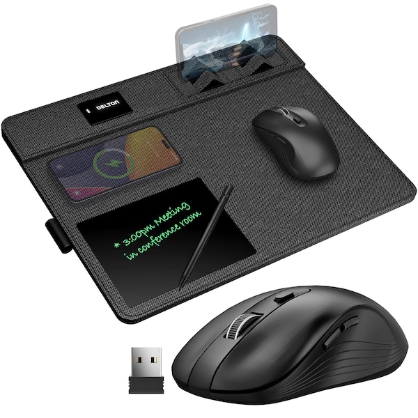 Experience unparalleled comfort and reliability with the Delton S8 wireless mouse, boasting a contoured design for ergonomic hand fit and powered by our precise optical sensor, ensuring consistent performance. Crafted based on user input, it offers a lightweight build, soft-touch finish, and seamless operation on various surfaces. Featuring well-positioned buttons, a smooth scroll wheel, and enduring battery life, it's the ultimate choice for home or office. Elevate productivity with the Delton D101 mouse pad, combining a spacious faux stitched leather surface with wireless charging capability up to 15W. Its digital notepad feature lets you jot down ideas effortlessly, keeping you focused on tasks. Included are the S8 mouse, D101 charging station, USB receiver, cables, and user manual for a complete setup.